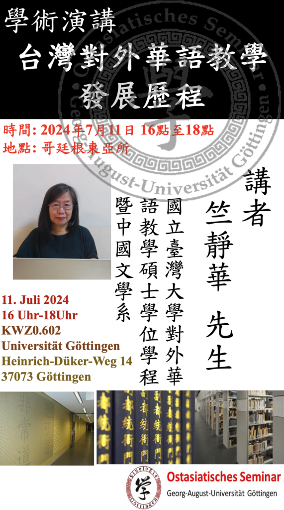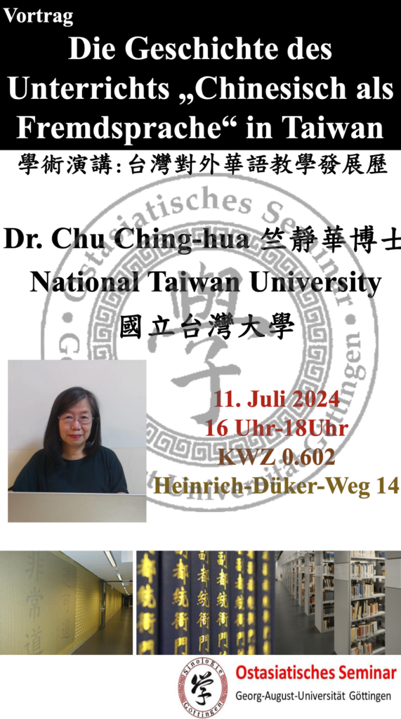Wir laden Sie herzlich zu einem spannenden Vortrag von Dr. Chin-Hua Chu von der National Taiwan University ein. Dr. Chu wird über die Geschichte und Entwicklung des Unterrichts von „Chinesisch als Fremdsprache“ in Taiwan sprechen. Dieser Vortrag bietet eine einzigartige Gelegenheit, mehr über die Methoden und Herausforderungen des Sprachunterrichts in Taiwan zu erfahren.