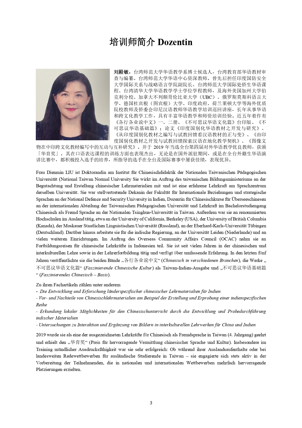 臺灣師範大學華語教學系博士候選人,曾任教於美國柏克萊大學、加拿大UBC與德國圖賓根大學,具多年華語教學與師資培訓經驗,2019年獲得「華育獎」殊榮。